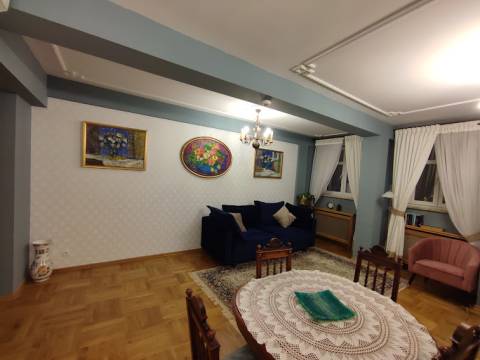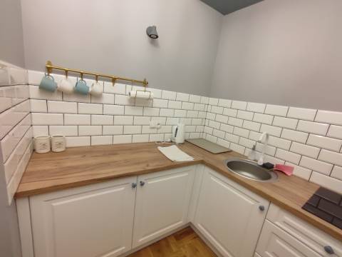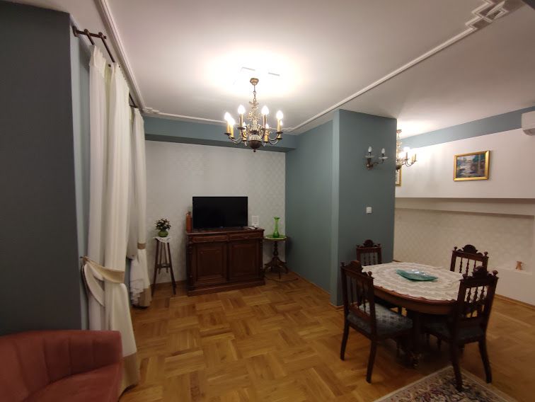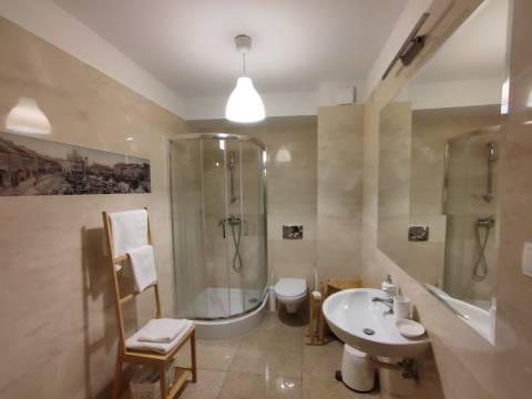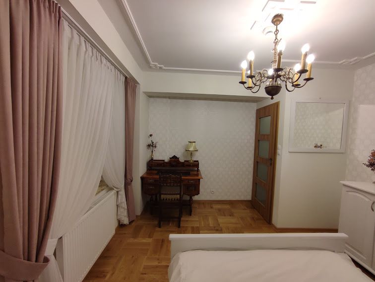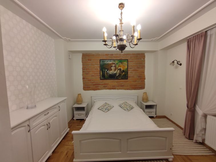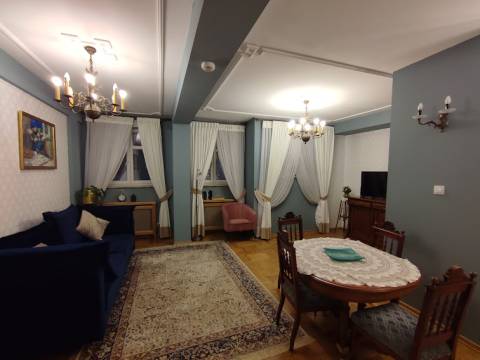 Apartament 201 ma powierzchnię 50 m2 i znajduje się na drugim piętrze kamienicy z oknami z widokiem na rynek. Jest to bardzo przestronny apartament, w którym może zatrzymać się do 4 osób, umeblowany w stylu nowoczesnym. W skład apartamentu wchodzą trzy pomieszczenia: salon wraz aneksem kuchennym i salonikiem, sypialnia oraz łazienka. Salon wyposażony jest w rozkładaną kanapę, fotel, stół z czterema krzesłami, konsolę i telewizor z programami telewizji naziemnej. Częścią salonu jest aneks kuchenny wyposażony w lodówkę, elektryczną płytę grzewczą dwupalnikową, czajnik elektryczny, komplet naczyń, sztućców, garnków oraz innych akcesoriów kuchennych. W osobnej sypialni znajdą Państwo podwójne łóżko o szerokości 1,80 m oraz obszerną komodę jak również toaletkę i lustro. Sypialnia posiada okno skierowane na klatkę schodową. Przestronna łazienka wyposażona jest w kabinę prysznicową. W apartamencie dostępna jest również deska do prasowania, żelazko, suszarka do włosów, komplet ręczników, klimatyzacja (w salonie) oraz darmowe Wi-Fi. W apartamencie obowiązuje zakaz palenia.