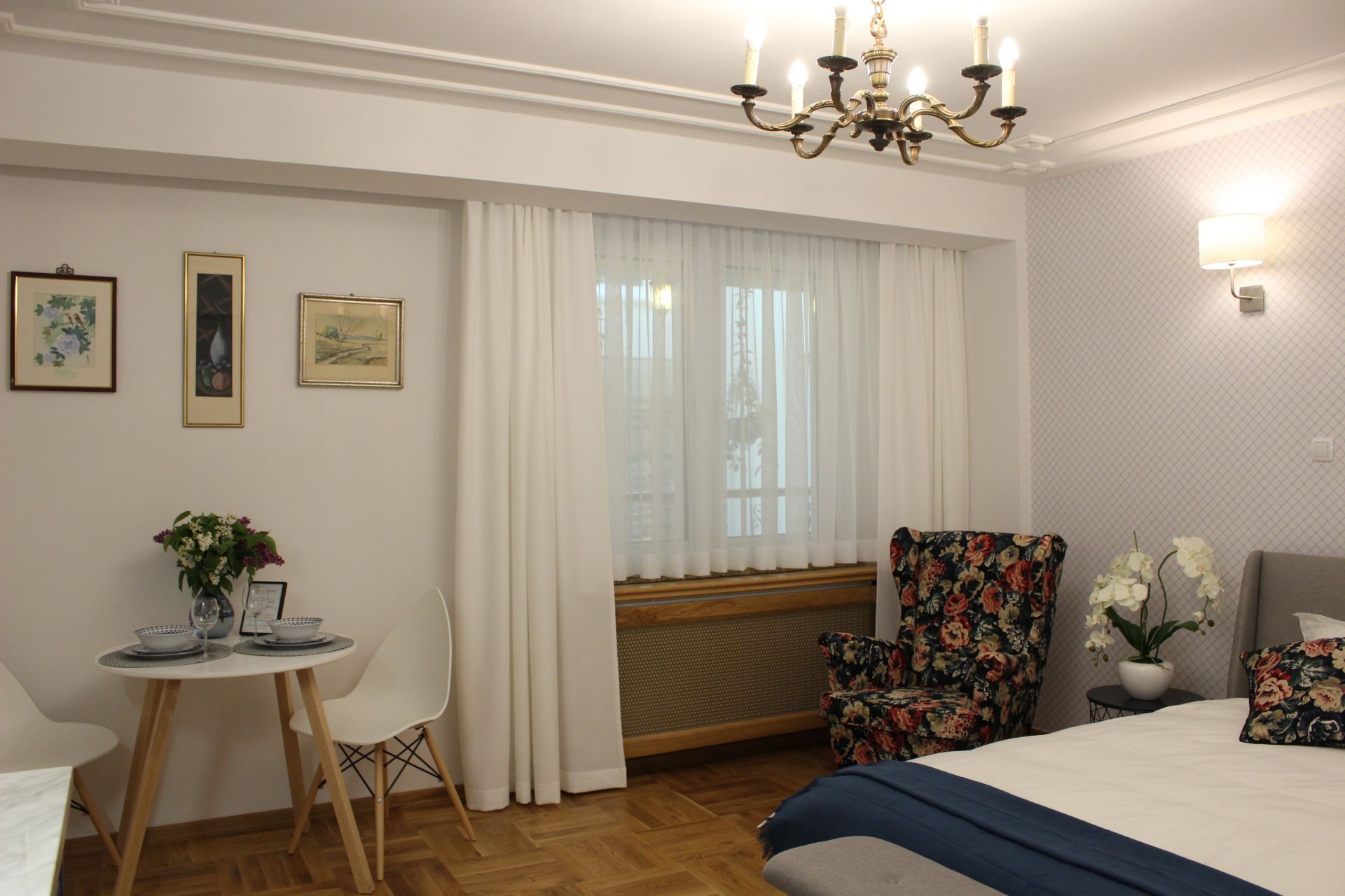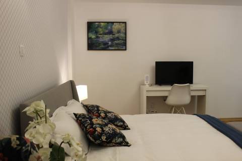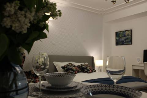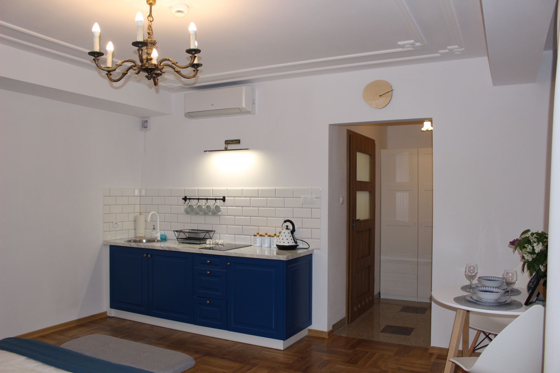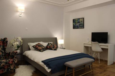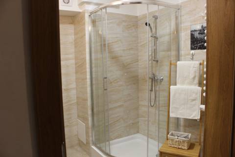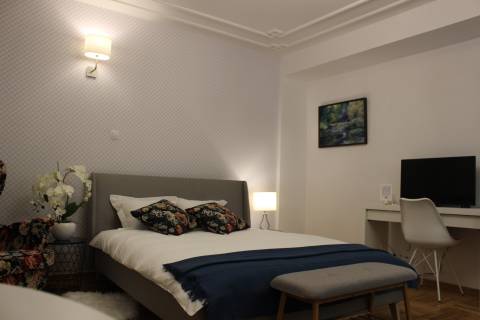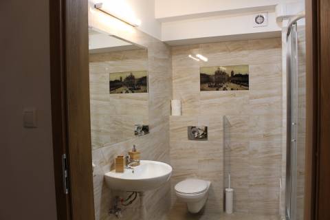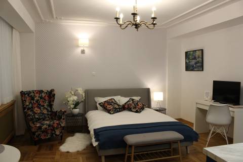 Apartament 203 ma powierzchnię 30 m2 i znajduje się na drugim piętrze kamienicy. Jest to mały apartament, odpowiedni dla dwóch osób umeblowany w stylu nowoczesnym. W skład apartamentu wchodzą dwa pomieszczenia: sypialnia wraz z aneksem kuchennym oraz łazienka. Salon wyposażony jest w podwójne łóżko o szerokości 1,60 m, konsolę, fotel, stół z dwoma krzesłami i telewizor 32 calowy z programami telewizji naziemnej. Szafę znajdą Państwo w przedpokoju. Aneks kuchenny wyposażony jest w lodówkę, elektryczną płytę grzewczą dwupalnikową, komplet naczyń, sztućców, garnków oraz innych akcesoriów kuchennych. Wygodna łazienka wyposażona jest w kabinę prysznicową. W apartamencie dostępna jest również deska do prasowania, żelazko, suszarka do włosów, komplet ręczników, odkurzacz oraz darmowe Wi-Fi. Okno apartamentu wychodzi na galerię zadaszoną szklanym świetlikiem z tego też względu dostęp światła dziennego do apartamentu jest ograniczony. Apartament posiada klimatyzację.