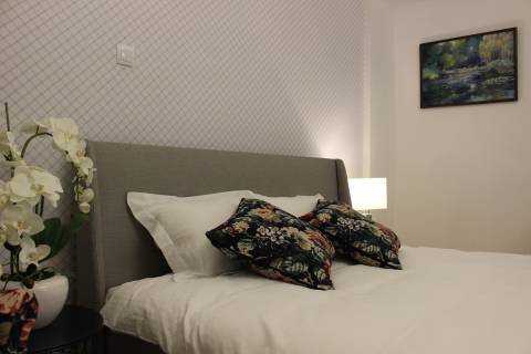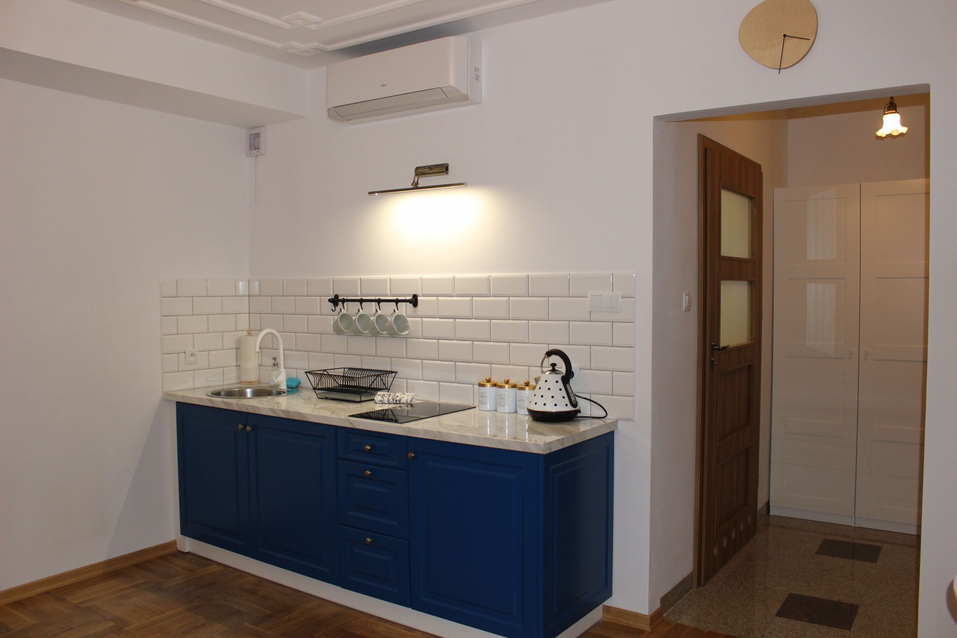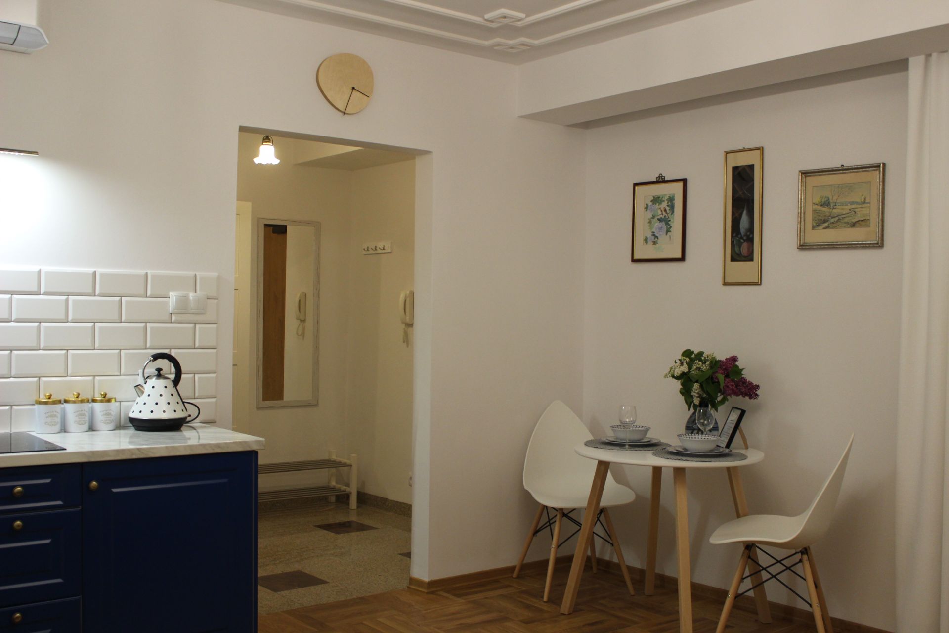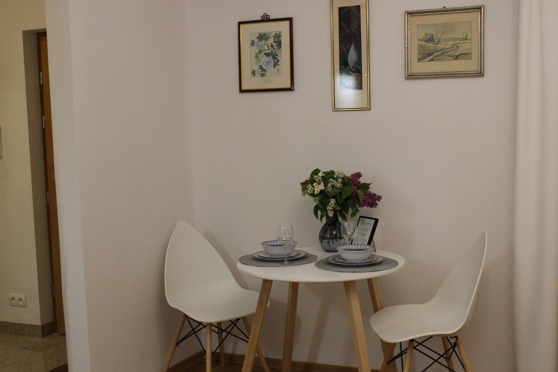 Apartament 203 ma powierzchnię 30 m2 i znajduje się na drugim piętrze kamienicy. Jest to mały apartament, odpowiedni dla dwóch osób umeblowany w stylu nowoczesnym. W skład apartamentu wchodzą dwa pomieszczenia: sypialnia wraz z aneksem kuchennym oraz łazienka. Salon wyposażony jest w podwójne łóżko o szerokości 1,60 m, konsolę, fotel, stół z dwoma krzesłami i telewizor 32 calowy z programami telewizji naziemnej. Szafę znajdą Państwo w przedpokoju. Aneks kuchenny wyposażony jest w lodówkę, elektryczną płytę grzewczą dwupalnikową, komplet naczyń, sztućców, garnków oraz innych akcesoriów kuchennych. Wygodna łazienka wyposażona jest w kabinę prysznicową. W apartamencie dostępna jest również deska do prasowania, żelazko, suszarka do włosów, komplet ręczników, odkurzacz oraz darmowe Wi-Fi. Okno apartamentu wychodzi na galerię zadaszoną szklanym świetlikiem z tego też względu dostęp światła dziennego do apartamentu jest ograniczony. Apartament posiada klimatyzację.