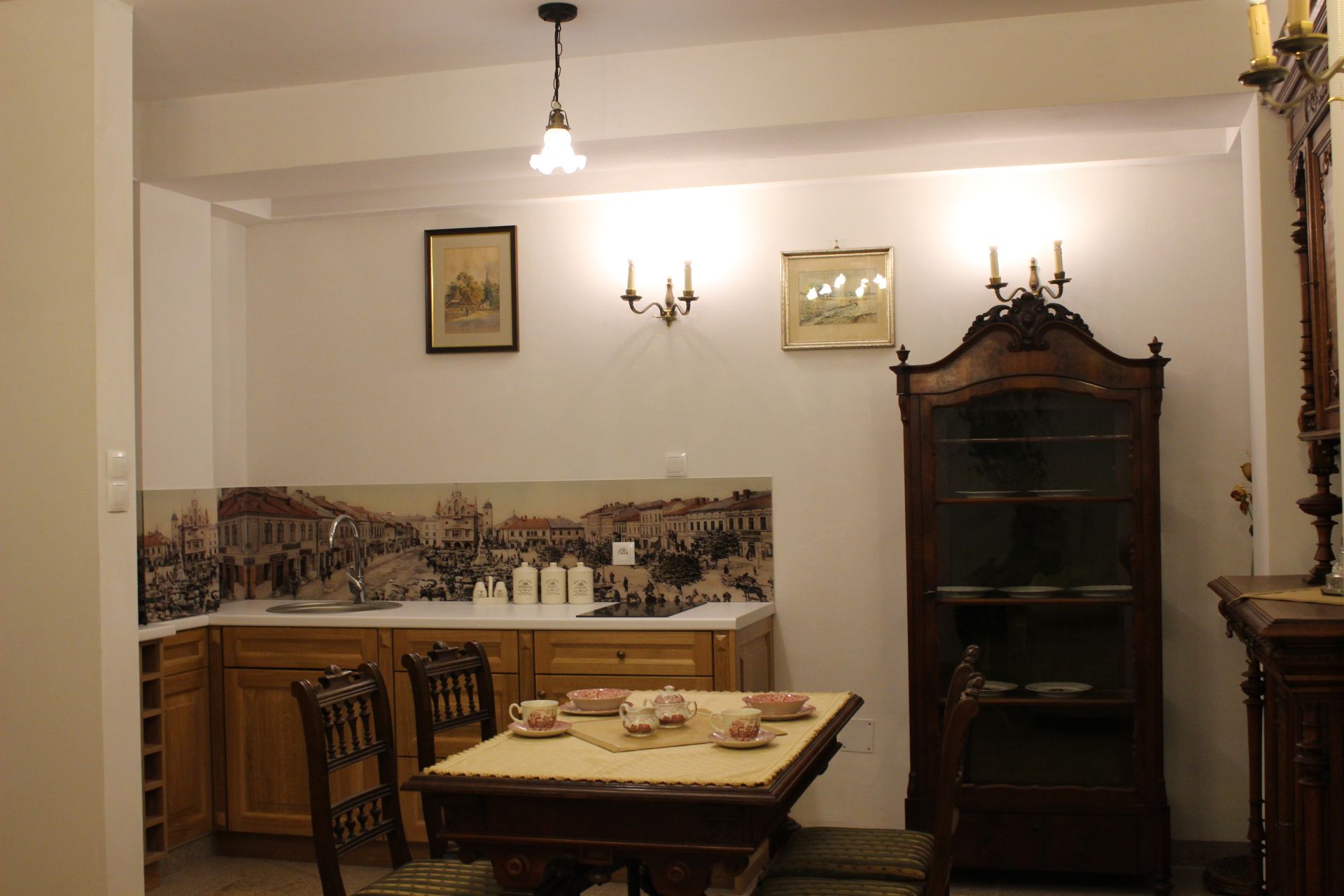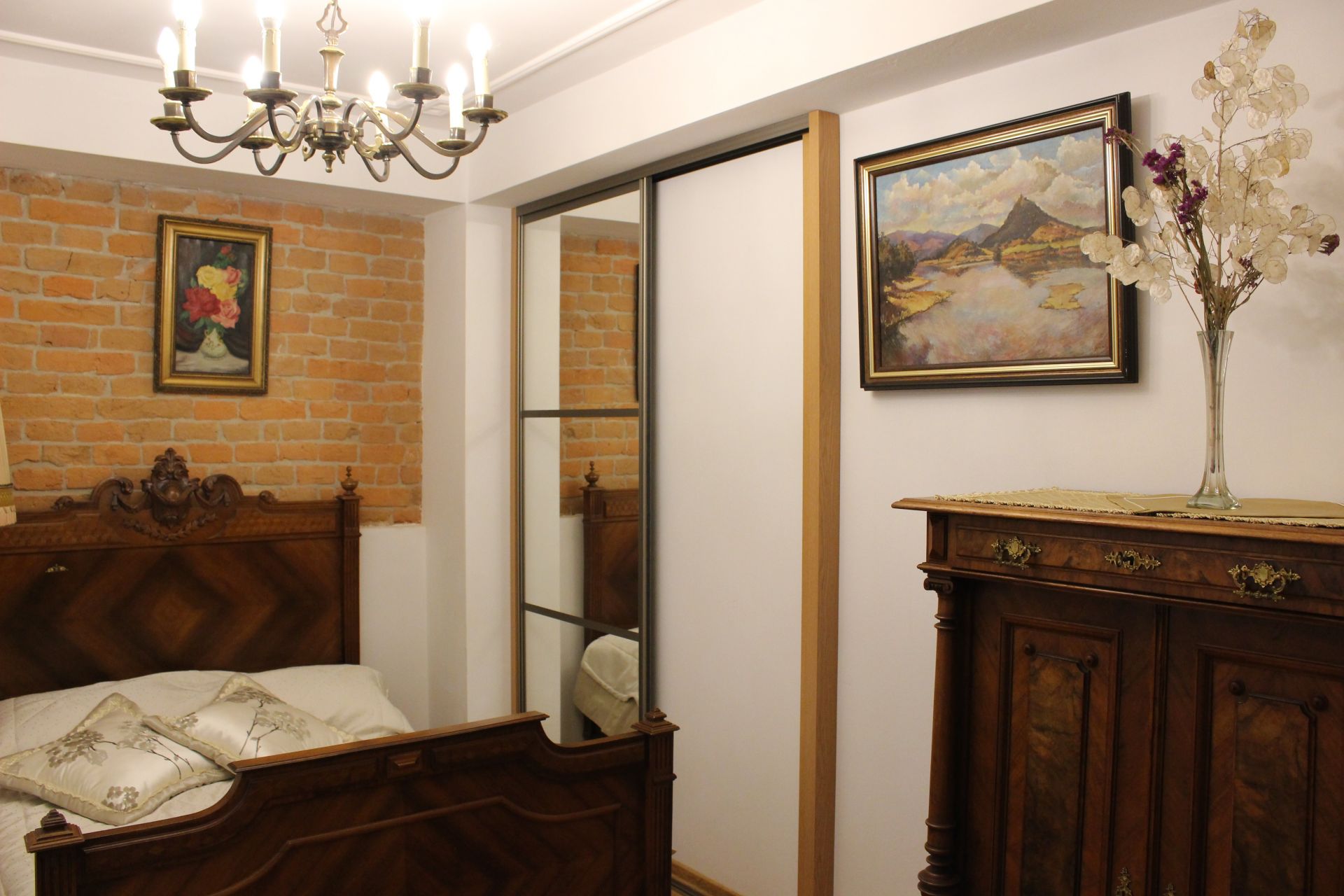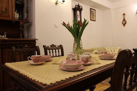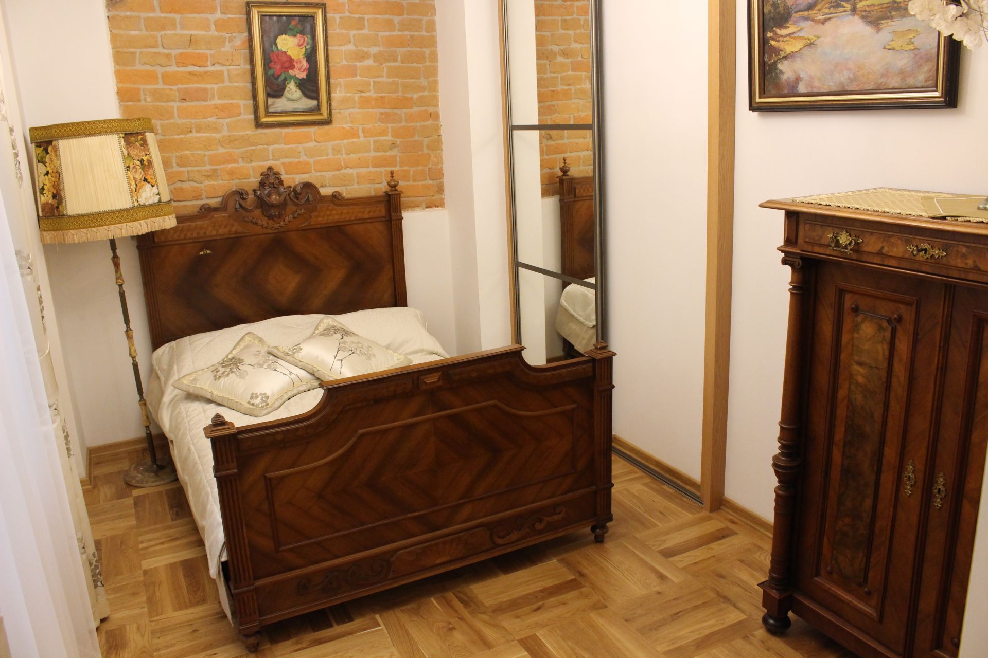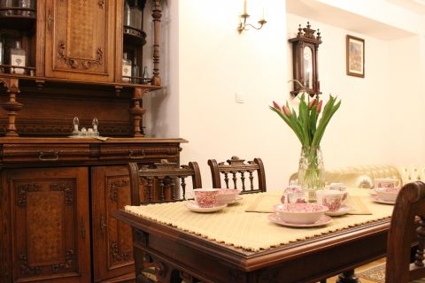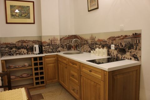 Apartament 204 ma powierzchnię 42 m2 i znajduje się na drugim piętrze kamienicy. Jest to mały apartament, odpowiedni dla dwóch osób, umeblowany w stylu eklektycznym. W skład apartamentu wchodzą trzy pomieszczenia: salonik wraz z aneksem kuchennym, sypialnia oraz łazienka. Salonik wyposażony jest w kanapę, komodę, ławę oraz telewizor z programami telewizji naziemnej. Częścią saloniku jest aneks kuchenny wyposażony w stylowy kredens, stół z czterema krzesłami, lodówkę, elektryczną płytę grzewczą dwupalnikową, komplet naczyń, sztućców, garnków oraz innych akcesoriów kuchennych. W osobnej sypialni znajdą Państwo pojedyncze łóżko o szerokości 1,40 m, szafę wnękową i komodę. Łazienka wyposażona jest w kabinę prysznicową. W apartamencie dostępna jest również deska do prasowania, żelazko, suszarka do włosów, komplet ręczników, odkurzacz oraz darmowe Wi-Fi. Okna apartamentu wychodzą na galerię zadaszoną szklanym świetlikiem, z tego też względu dostęp światła dziennego do apartamentu jest ograniczony.