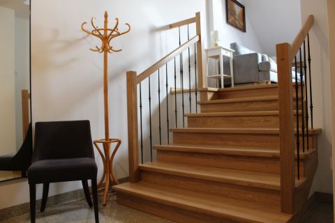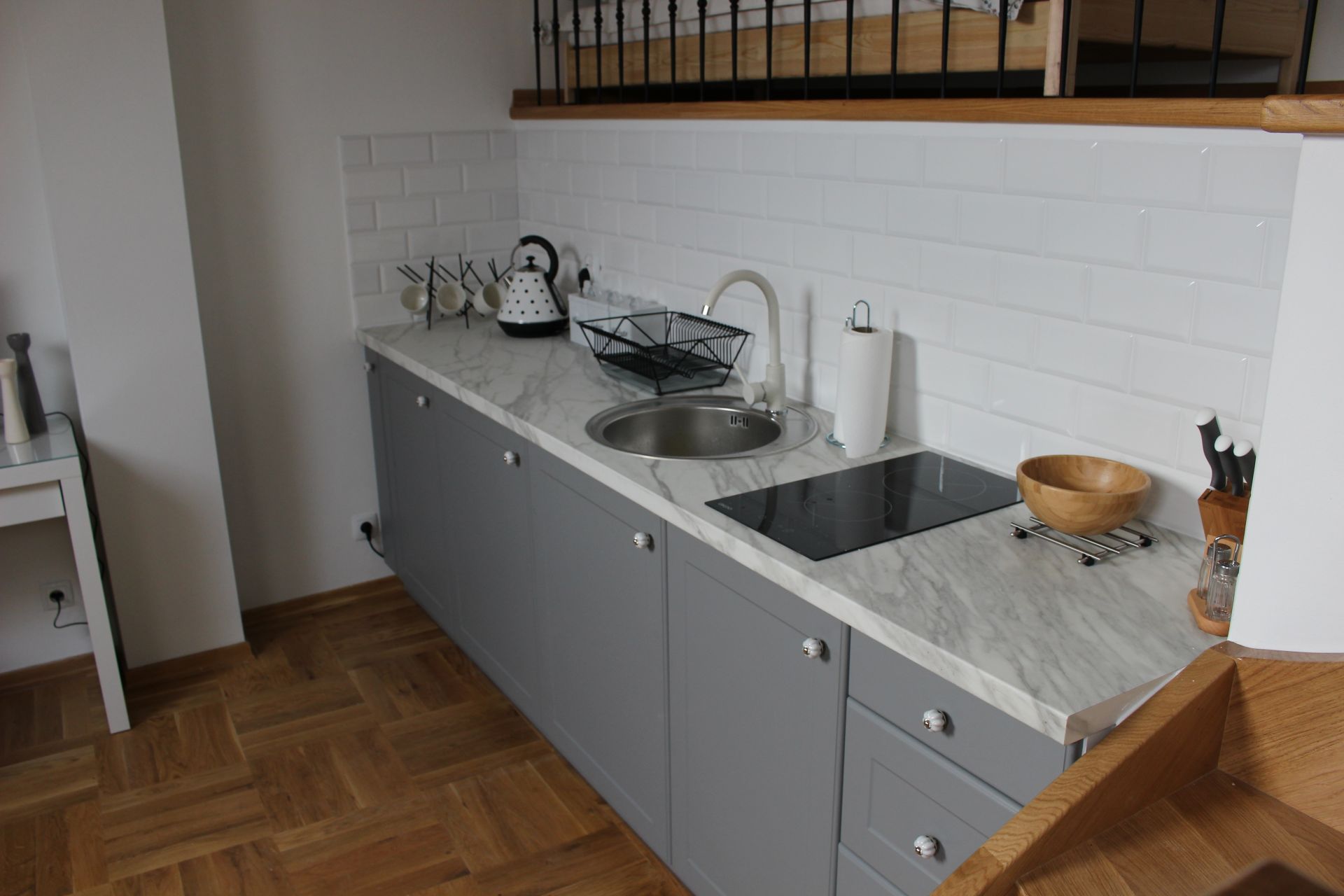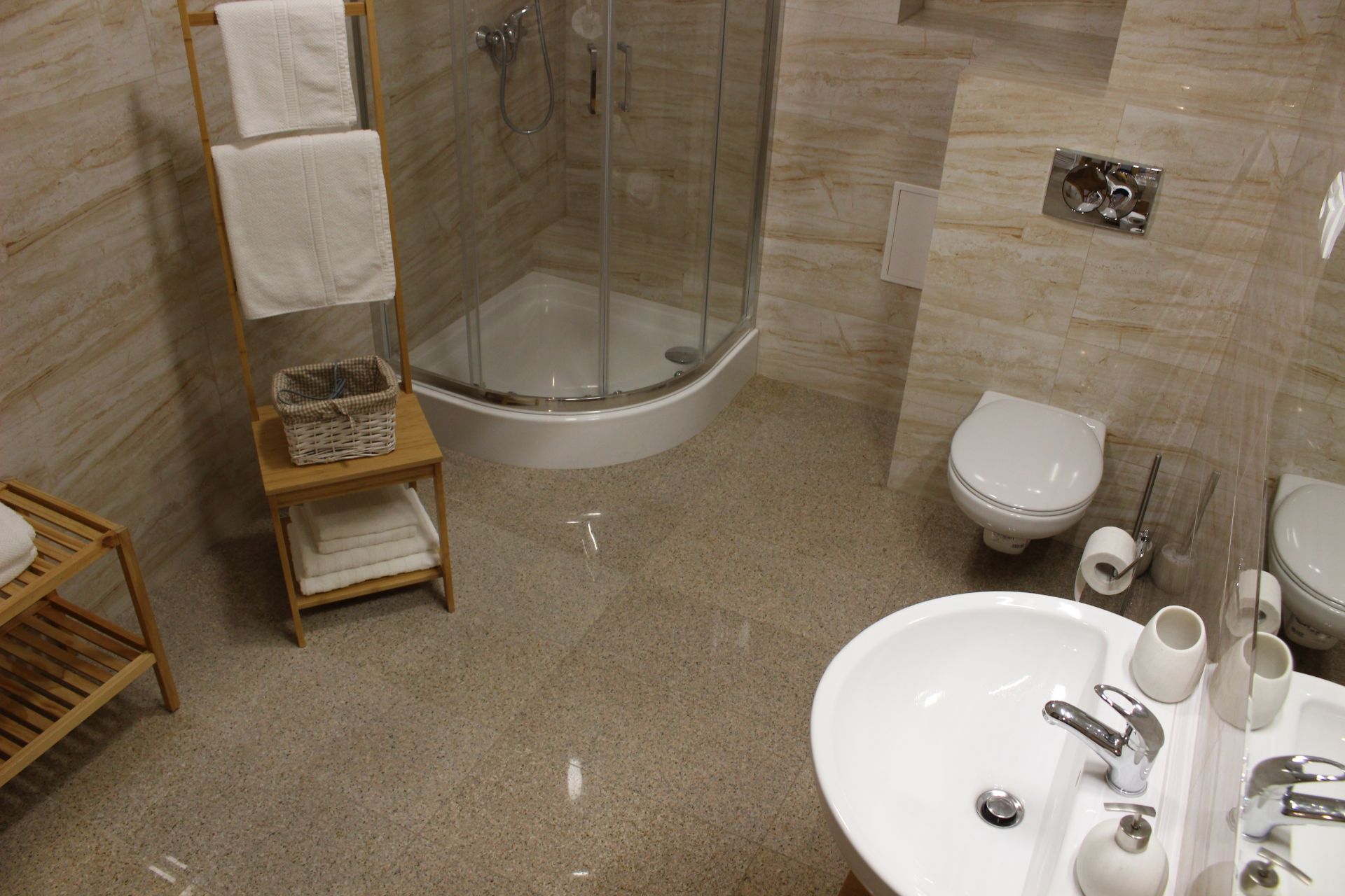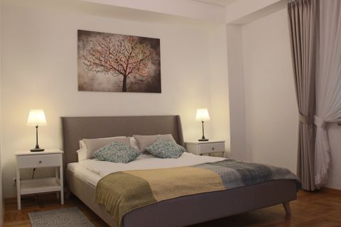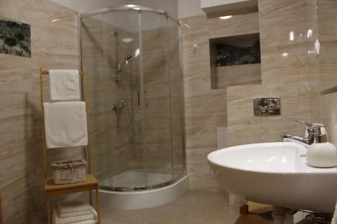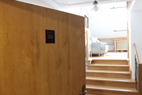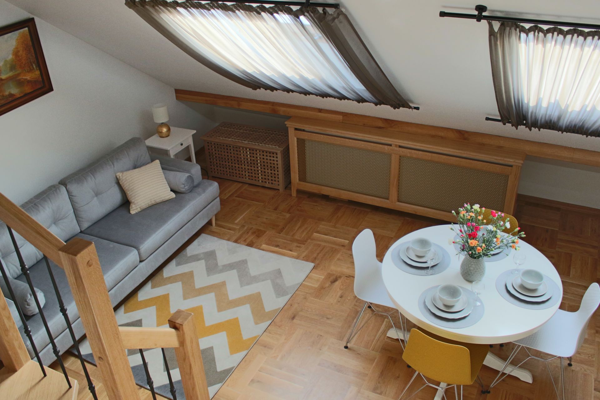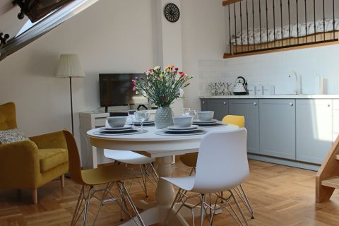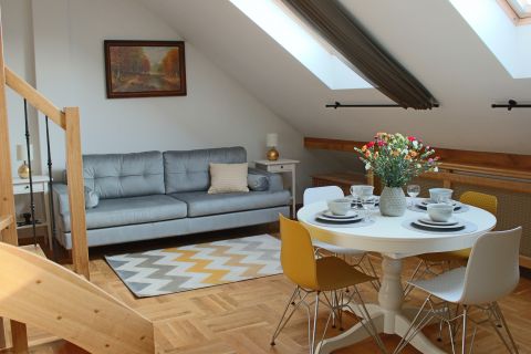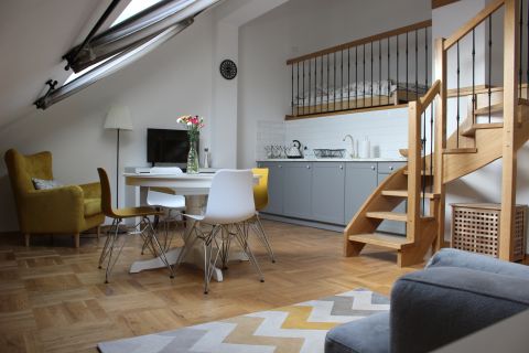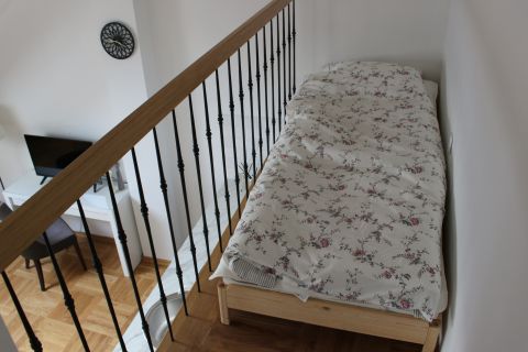 Apartament 301 ma powierzchnię 54 m2 i znajduje się na trzecim piętrze kamienicy. Jest to bardzo przestronny apartament, w którym może zatrzymać się do pięciu osób, umeblowany w stylu nowoczesnym. W skład apartamentu wchodzą trzy pomieszczenia: salon wraz aneksem kuchennym i antresolą, sypialnia oraz łazienka. Salon wyposażony jest w rozkładaną kanapę, fotel, stół z czterema krzesłami, konsolę i telewizor z programami telewizji naziemnej. Częścią salonu jest aneks kuchenny wyposażony w lodówkę, elektryczną płytę grzewczą dwupalnikową, komplet naczyń, sztućców, garnków oraz innych akcesoriów kuchennych. W salonie znajduje się również antresola, na której jest dodatkowe pojedyncze łóżko o szerokości 0,80 m. W osobnej sypialni znajdą Państwo podwójne łóżko o szerokości 1,60 m oraz obszerną szafę wnękową. Sypialnia posiada okno skierowane na klatkę schodową. Przestronna łazienka wyposażona jest w kabinę prysznicową. W apartamencie dostępna jest również deska do prasowania, żelazko, suszarka do włosów, komplet ręczników, odkurzacz, klimatyzacja (w salonie) oraz darmowe Wi-Fi. Apartament częściowo znajduje sią na poddaszu a światło dzienne doprowadzane jest oknami dachowymi.