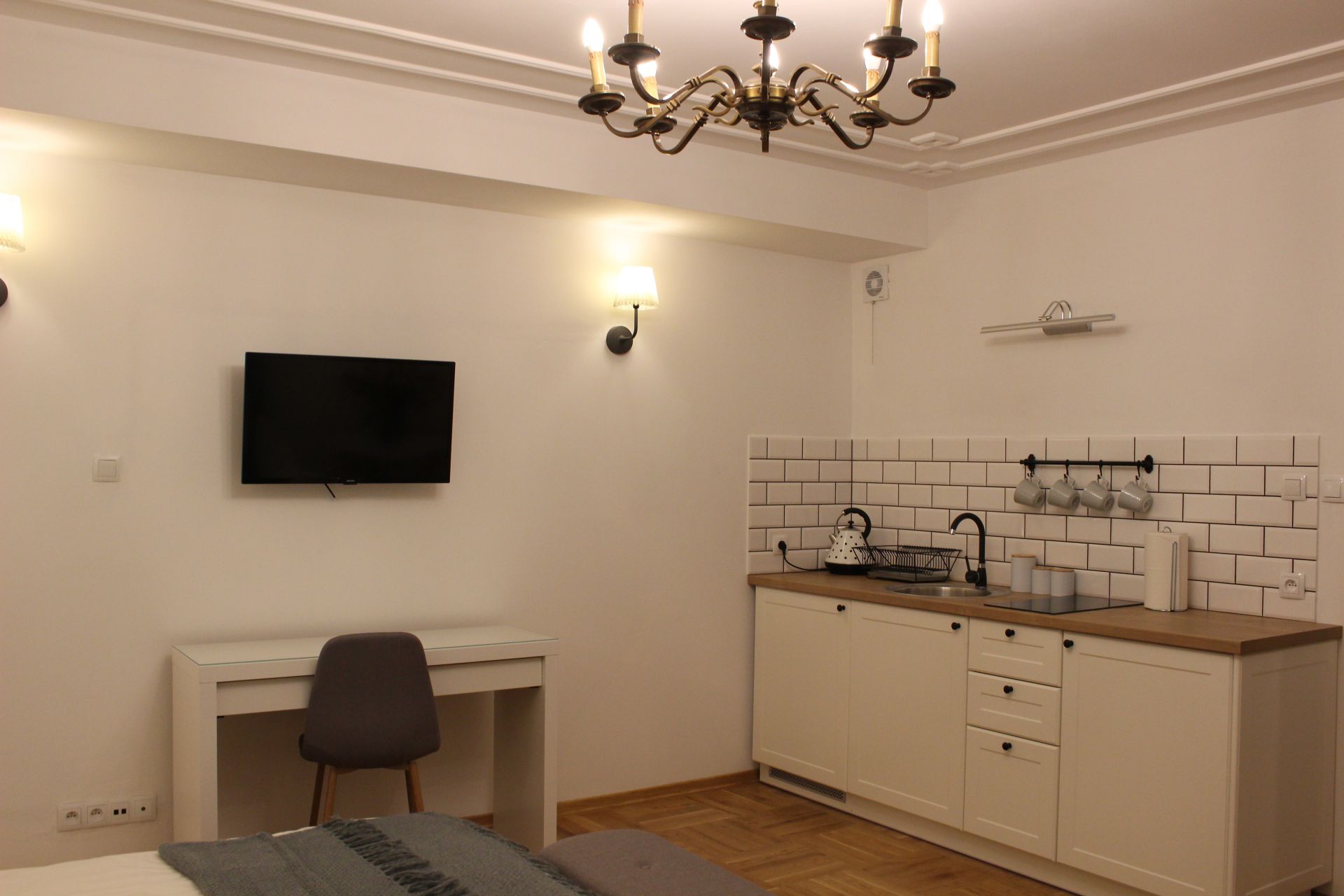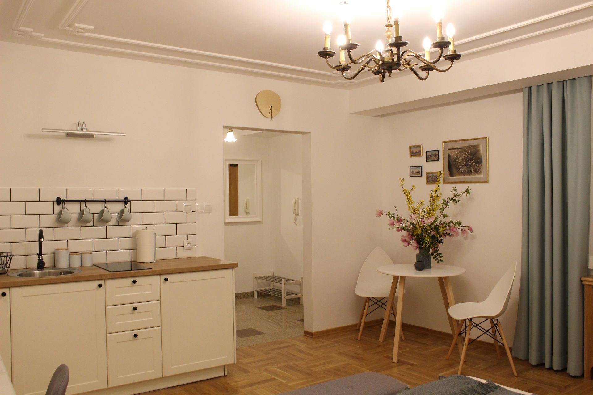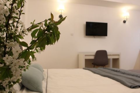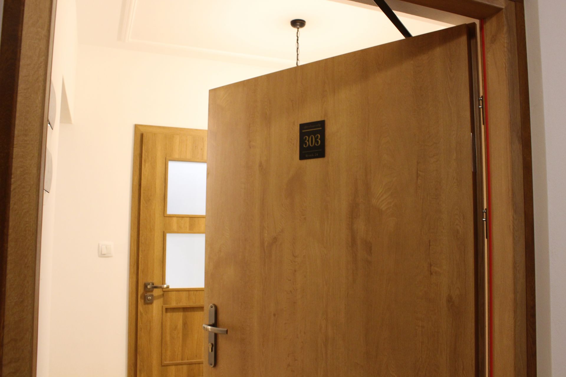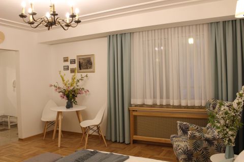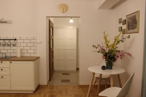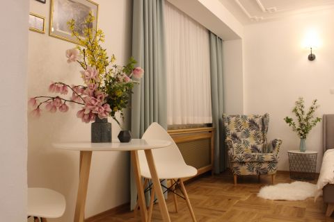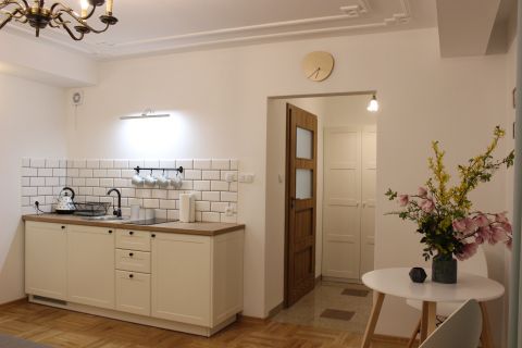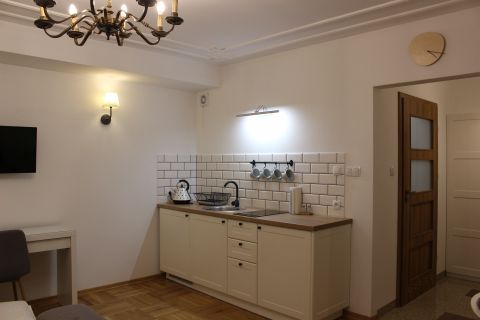 Apartament 303 ma powierzchnię 30 m2 i znajduje się na trzecim piętrze kamienicy. Jest to mały apartament, odpowiedni dla dwóch osób umeblowany w stylu nowoczesnym. W skład apartamentu wchodzą dwa pomieszczenia: sypialnia wraz z aneksem kuchennym oraz łazienka. Salon wyposażony jest w podwójne łóżko o szerokości 1,60 m, konsolę, fotel, stół z dwoma krzesłami i telewizor 32 calowy z programami telewizji naziemnej. Szafę znajdą Państwo w przedpokoju. Aneks kuchenny wyposażony jest w lodówkę, elektryczną płytę grzewczą dwupalnikową, komplet naczyń, sztućców, garnków oraz innych akcesoriów kuchennych. Wygodna łazienka wyposażona jest w kabinę prysznicową. W apartamencie dostępna jest również deska do prasowania, żelazko, suszarka do włosów, komplet ręczników, odkurzacz oraz darmowe Wi-Fi. Okno apartamentu wychodzi na galerię zadaszoną szklanym świetlikiem z tego też względu dostęp światła dziennego do apartamentu jest ograniczony.
