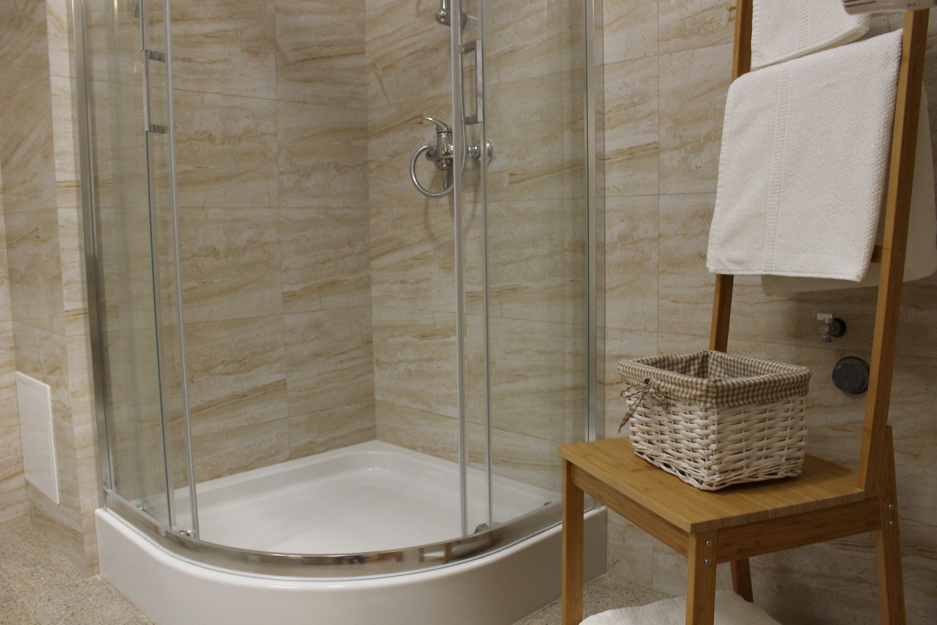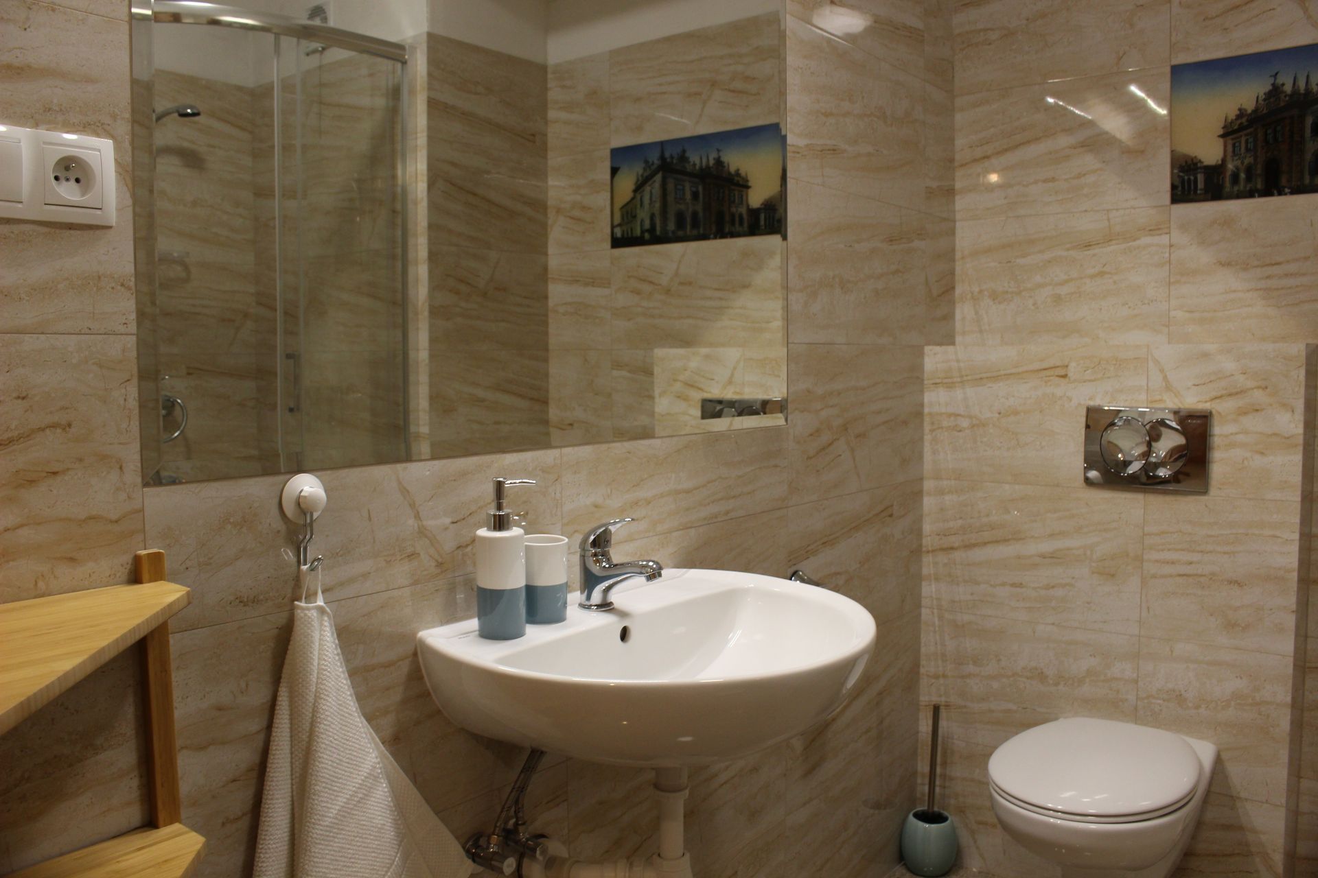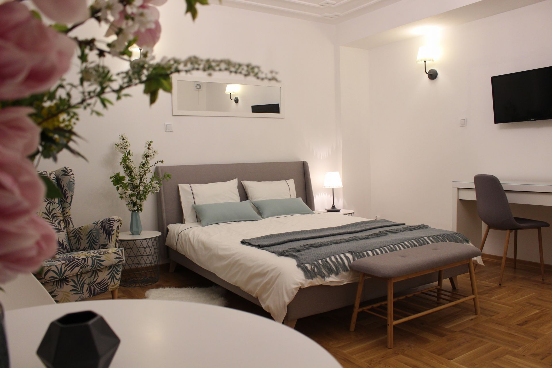 Apartament 303 ma powierzchnię 30 m2 i znajduje się na trzecim piętrze kamienicy. Jest to mały apartament, odpowiedni dla dwóch osób umeblowany w stylu nowoczesnym. W skład apartamentu wchodzą dwa pomieszczenia: sypialnia wraz z aneksem kuchennym oraz łazienka. Salon wyposażony jest w podwójne łóżko o szerokości 1,60 m, konsolę, fotel, stół z dwoma krzesłami i telewizor 32 calowy z programami telewizji naziemnej. Szafę znajdą Państwo w przedpokoju. Aneks kuchenny wyposażony jest w lodówkę, elektryczną płytę grzewczą dwupalnikową, komplet naczyń, sztućców, garnków oraz innych akcesoriów kuchennych. Wygodna łazienka wyposażona jest w kabinę prysznicową. W apartamencie dostępna jest również deska do prasowania, żelazko, suszarka do włosów, komplet ręczników, odkurzacz oraz darmowe Wi-Fi. Okno apartamentu wychodzi na galerię zadaszoną szklanym świetlikiem z tego też względu dostęp światła dziennego do apartamentu jest ograniczony.