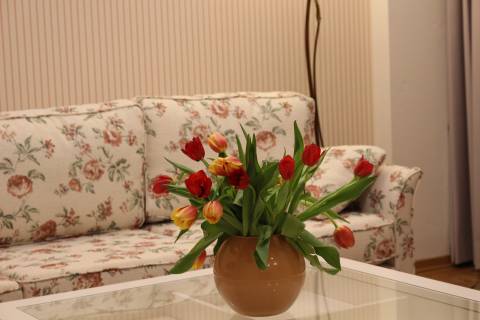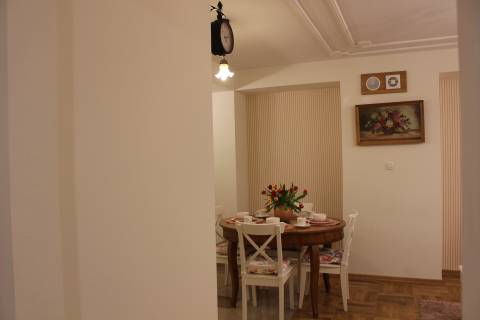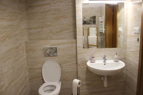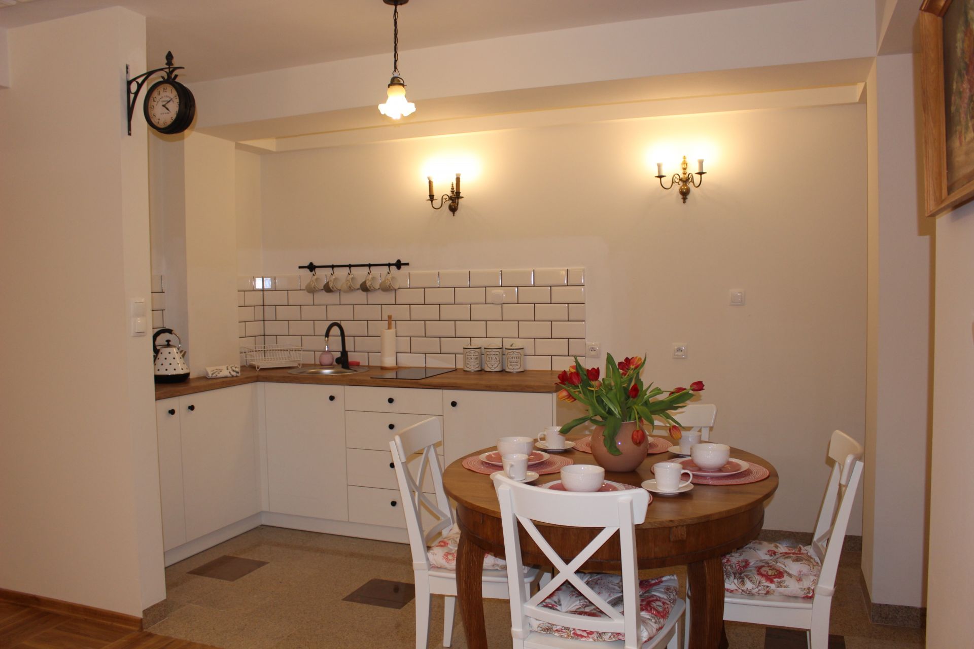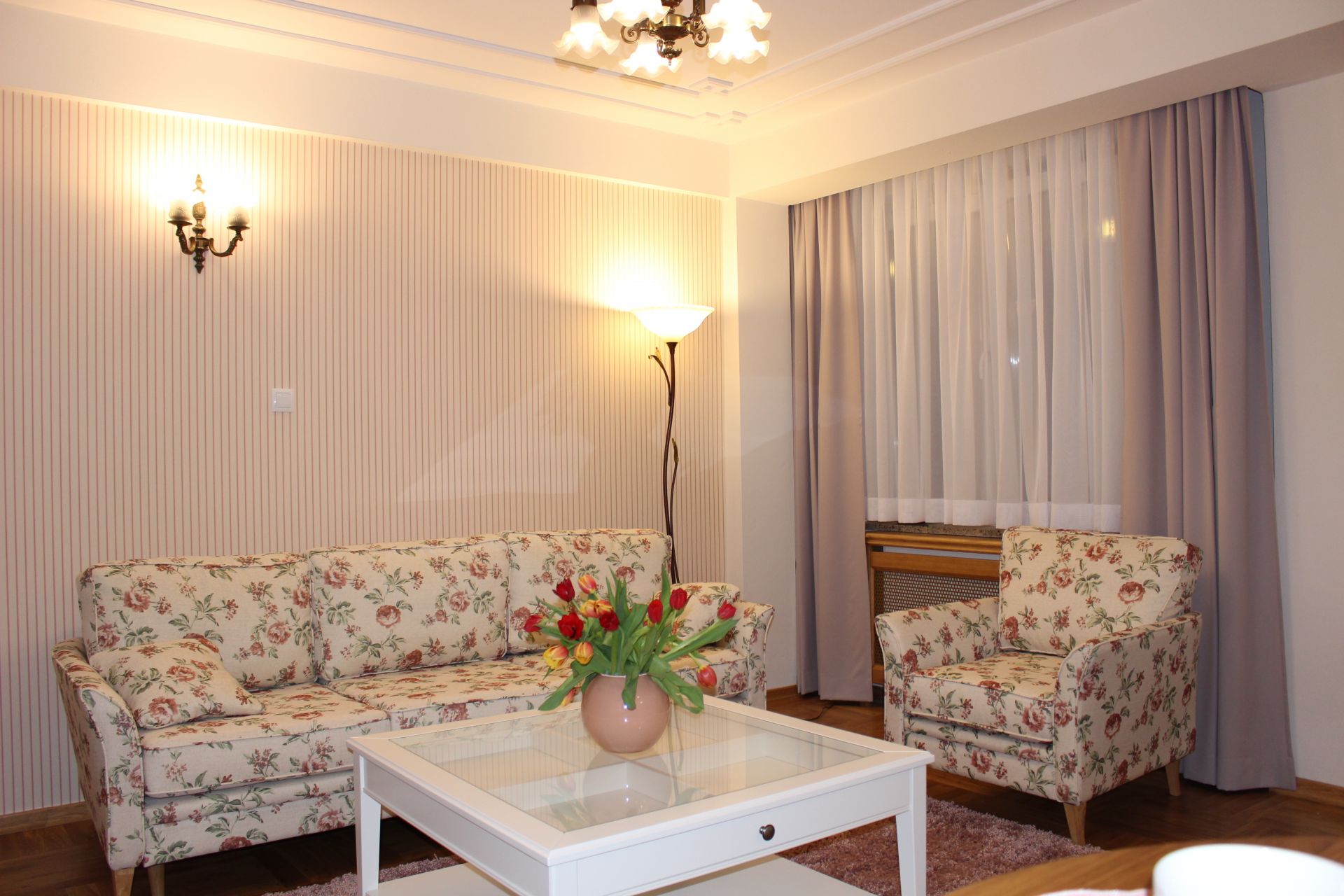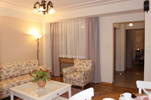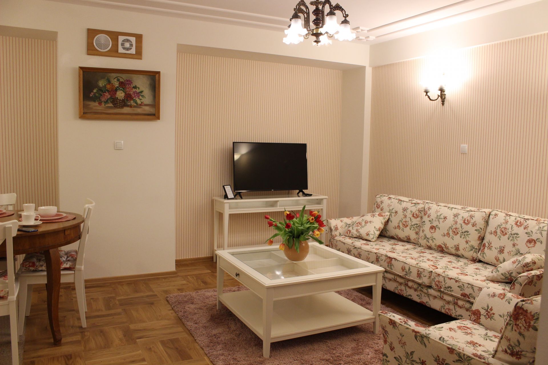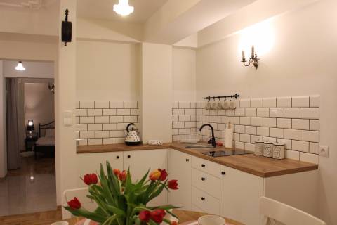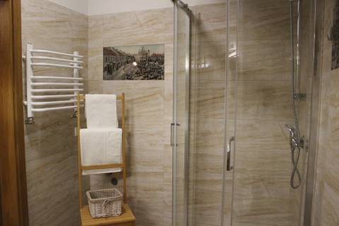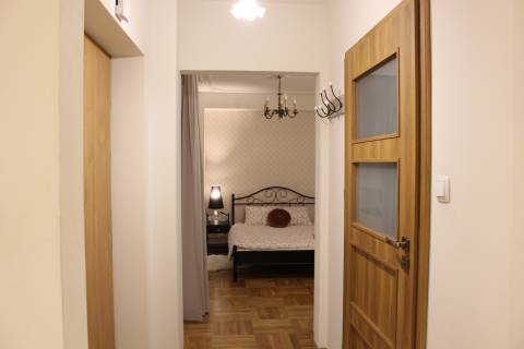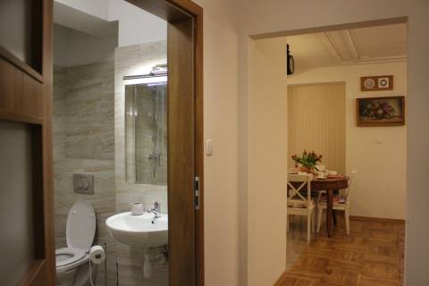 Apartament 304 ma powierzchnię 42 m2 i znajduje się na trzecim piętrze kamienicy. Jest to przytulny apartament, odpowiedni dla dwóch jak i maksymalnie dla czterech osób, umeblowany w stylu nowoczesnym i angielskim. W skład apartamentu wchodzą trzy pomieszczenia: salonik wraz z aneksem kuchennym, sypialnia oraz łazienka. Salonik wyposażony jest w rozkładaną sofę, fotel, lampę do czytania ławę oraz komodę wraz telewizorem z programami telewizji naziemnej. Częścią saloniku jest aneks kuchenny wyposażony w stylowy duży stół z czterema krzesłami, lodówkę, elektryczną płytę grzewczą dwupalnikową, komplet naczyń, sztućców, garnków oraz innych akcesoriów kuchennych. W osobnej sypialni znajdą Państwo pojedyncze łóżko o szerokości 1,60 m, szafę wnękową i fotelik. Wygodna łazienka wyposażona jest w kabinę prysznicową. W apartamencie dostępna jest również deska do prasowania, żelazko, suszarka do włosów, komplet ręczników, odkurzacz oraz darmowe Wi-Fi. Okna apartamentu wychodzą na galerię zadaszoną szklanym świetlikiem, z tego też względu dostęp światła dziennego do apartamentu jest ograniczony.
